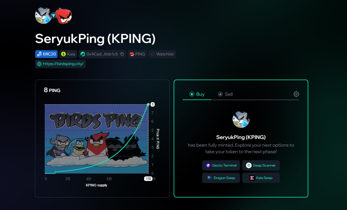 세력핑은 민트클럽을 통해 민팅되었고 발행 수량에 대응하는 자산이 락업되어 있다. 민트 크럽은 탈 중앙화 민팅 플랫폼이다. 발행 정보와 본딩커브는 아래와 같다.